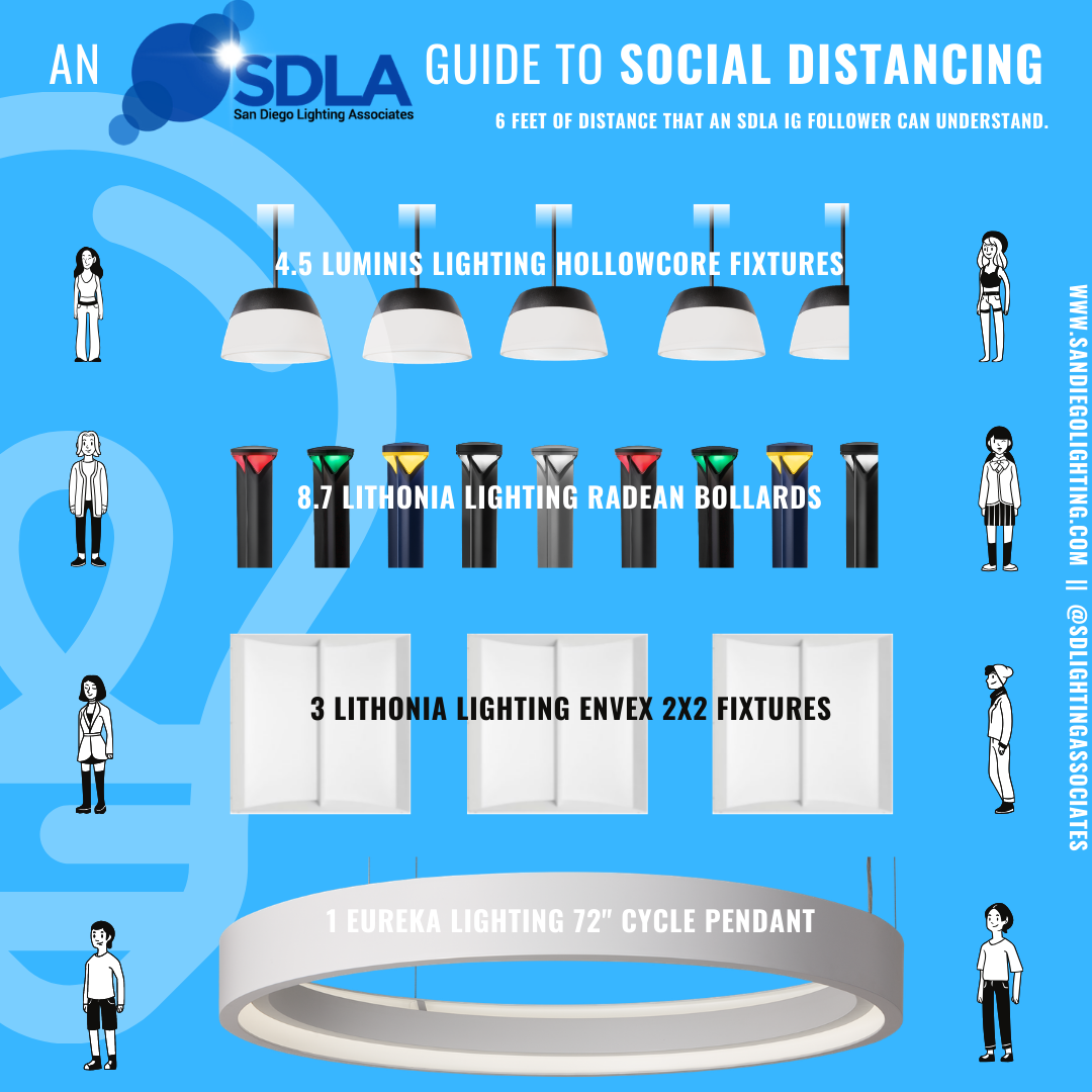 San Diego Lighting Associates made this compelling infographic correlating the 6-foot social distance rule to luminaire sizes: