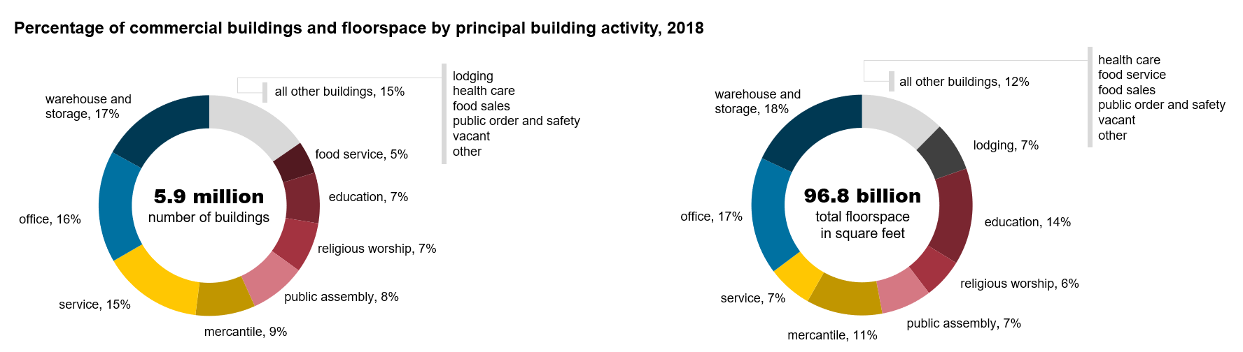 Warehouse and storage, office, and service buildings together accounted for 48% of all commercial buildings and 42% of total commercial building floorspace.