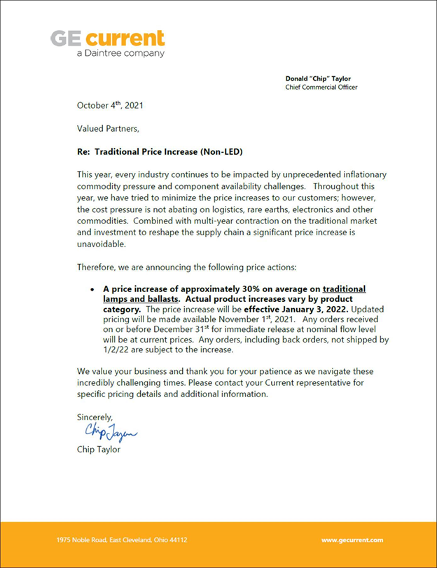 GE Current, a Daintree company, sent us this announcement on Monday detailing an average 30% price increase for legacy (non-LED) lamps and ballasts effective January 2, 2022. The average 30% increase may seem like a big spike, but when waning demand is layered on top of a challenging supply chain environment, charging $2.60 for an unpopular $2 T8 lamp seems rather reasonable.