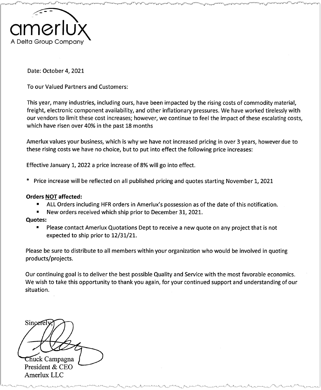 Amerlux will increase prices 8% effective January 1, 2022.