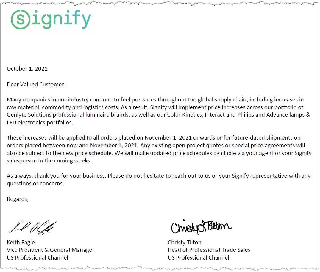 "Due to pressures felt throughout the global supply chain, including raw materials, commodities and logistics, Signify will implement price increases for a select portion of our professional lighting products, effective August 9, 2021. The price increases will occur within our Genlyte Solutions collection of luminaire brands and our Lamps and LED Electronics portfolios, namely the Philips and Advance brands.