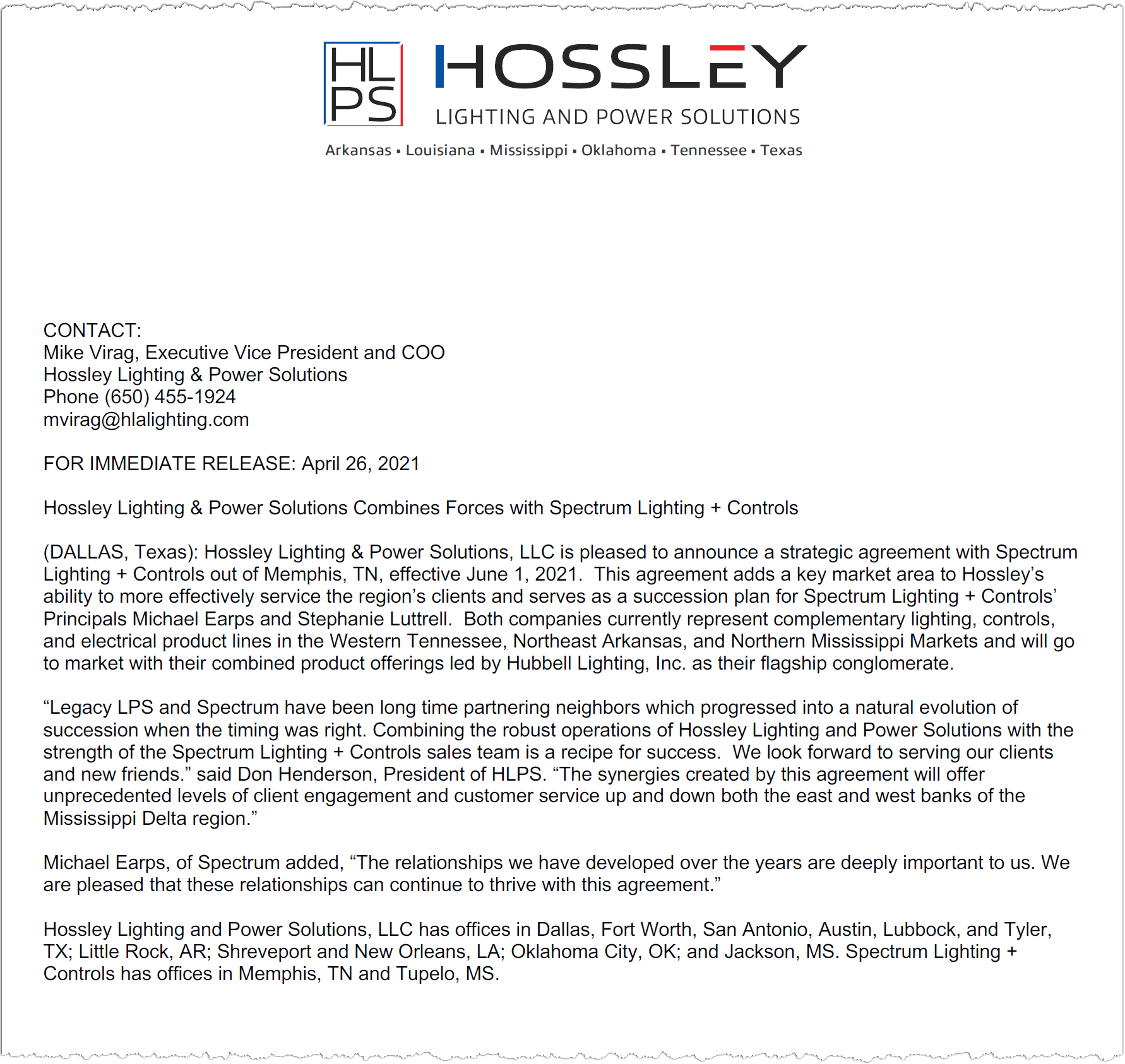 - July 2020: Dallas-based Hossley Lighting and Arkansas-based Lighting & Power Solutions announce a merger that has the new HLPS covering six states with both lighting lines and electrical supply lines.
