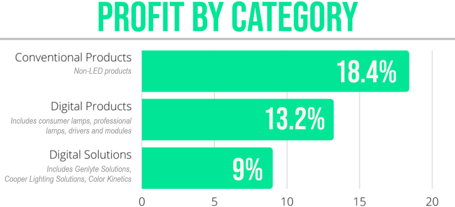 Conventional products like HID, linear and compact fluorescent, halogen, incandescent and electronic ballasts are still relevant. UV-C sources might be the only R&D related expenses in this category, which may enable the impressive margins in Conventional Products category.