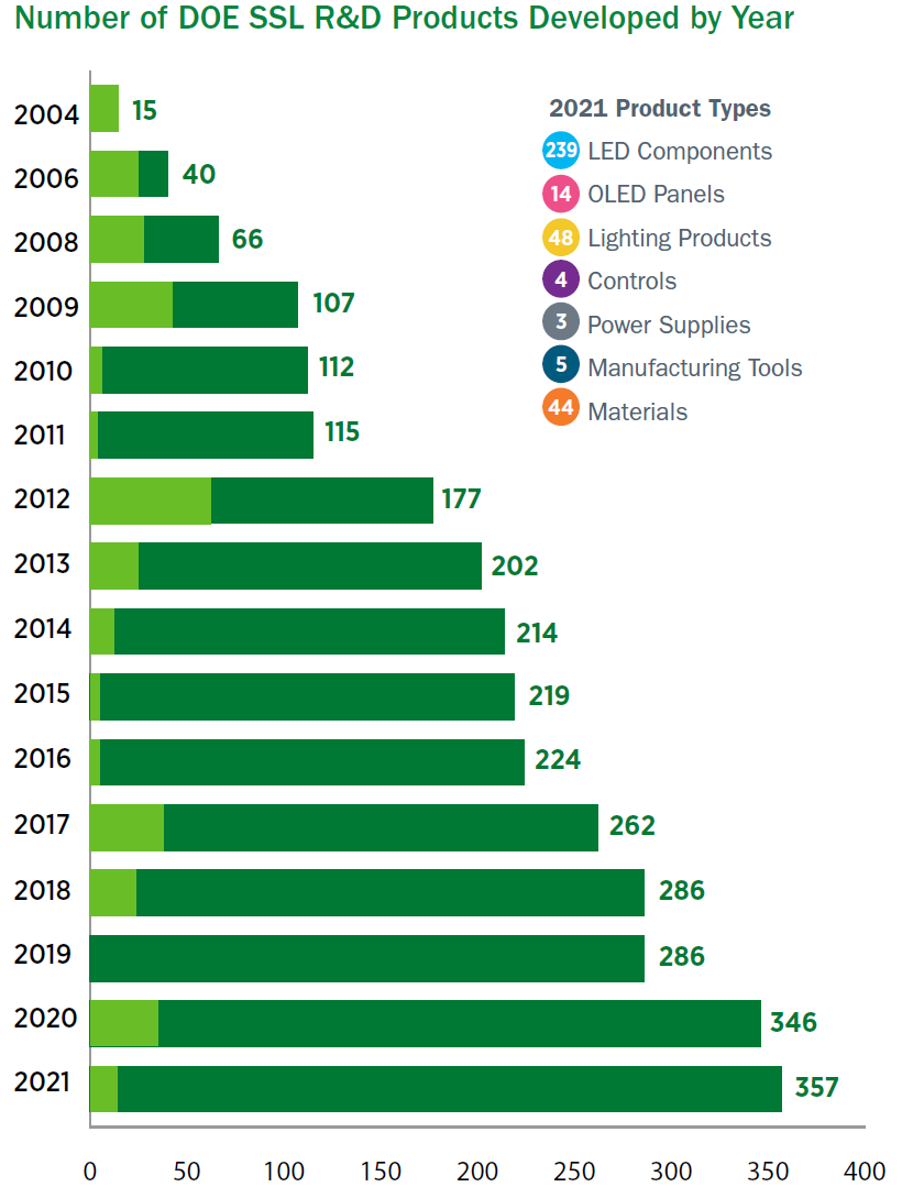 The U.S. Department of Energy (DOE) began funding solid-state lighting (SSL) R&D in 2000, and to date has supported 347 SSL projects in the areas of applied research, product development, and manufacturing R&D. These projects are funded through the DOE SSL Program and the Small Business Innovation Research (SBIR) Program. This support has directly advanced the scientific understanding and performance of SSL through the publication of articles in technical journals, the creation of intellectual property (with 458 patents submitted), and the direct development of more than 357 commercially available, state-of-the-art products by U.S. companies. Those products—which include lamps, luminaires,