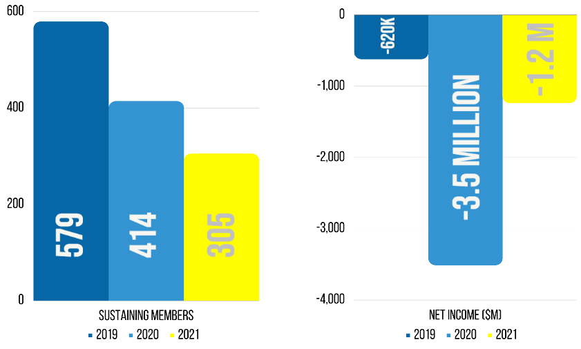 The two largest categories of individual members, associate and member, have hovered around the 5,000-person total over the last three years. But total membership dues have declined nearly $400,000 from 2019 to 2021 mainly due to a decline in sustaining membership.