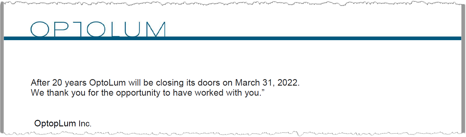TEMPE, ARIZONA -- In what appears to be a hastily written announcement sent to business partners yesterday, LED lighting maker OptoLum has announced that it is closing its doors after 20 years of business. In 2020, the Tempe, Arizona company reported having 11 employees. Earlier this month, long-time CEO Joel Dry was reportedly replaced by company co-owner Karen Baker. Today, OptoLum closes its doors due to what seems to be financial troubles.