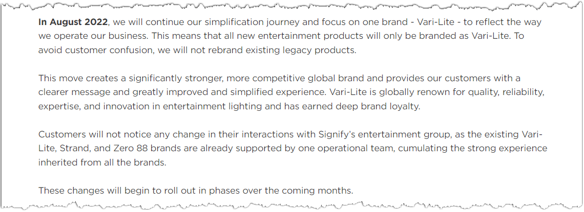 Strand has announced that the brands in Signify's entertainment group – Vari-Lite, Strand, and Zero 88 – will be combining under one name, Vari-Lite. The statement makes no reference to bankruptcy or litigation and instead explains that the changes are part of the company's "simplification journey." All new entertainment products will be branded as Vari-Lite and "to avoid customer confusion" existing legacy products will not be rebranded.
