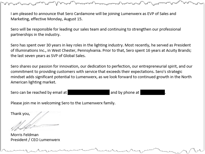 Longtime lighting industry executive, Sero Cardamone, will soon be joining the well-known Montreal-based architectural lighting brand, Lumenwerx, on August 15 as EVP of Sales and Marketing. Most recently, Cardamone served as President of Philadelphia-area lighting agent, Illuminations Inc. Prior to that, Cardamone spent 16 years at Acuity Brands – the last seven years as Senior Vice President of Global Sales.