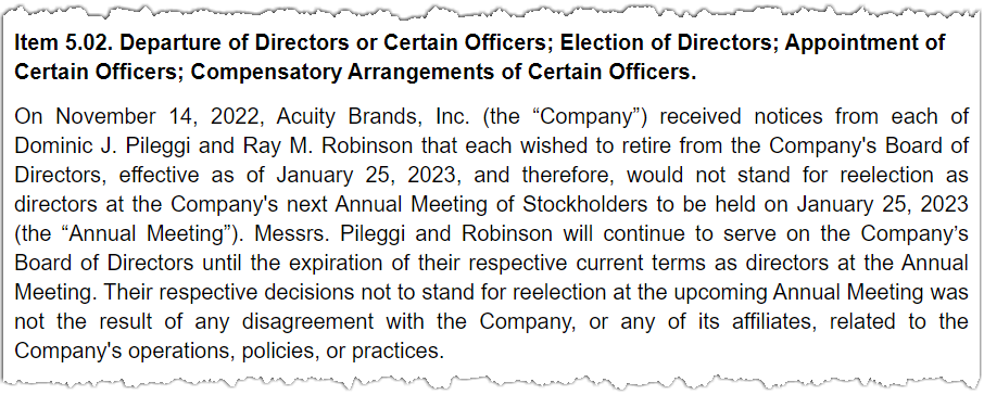 An SEC filing by Acuity Brands on Friday revealed that Dominic Pileggi and Ray Robinson will soon be leaving the Acuity Brands Board of Directors at the end of their current terms, effective January 25, 2023.