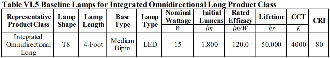 One of the many standards proposed by DOE is to raise the minimum efficacies for Integrated Omnidirectional Long Product commonly referred to as 4-foot T-LED lamps. Based on the current standards, it seems that T-LEDs are subject to the same 45 lm/W backstop minimum efficacy that apply to lower lumen Edison-base LED lamps.