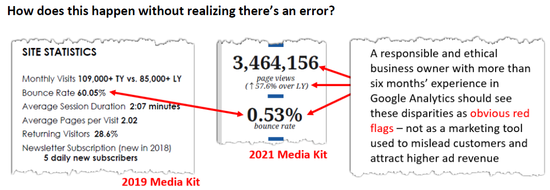 Very few advertisers likely give a rip about Bounce Rate, but the impossible Bounce Rate number published in EdisonReport Media Kits for years should have been the flashing police siren to EdisonReport’s publisher indicating that the data was clearly erroneous. Fixing the clearly-broken bounce rate issue would have caused EdisonReport to simultaneously fix the inflated 3-for-1 page view multiplier error, too. This was a clear warning flag that should have been noticed and fixed right away, but it persisted for years.