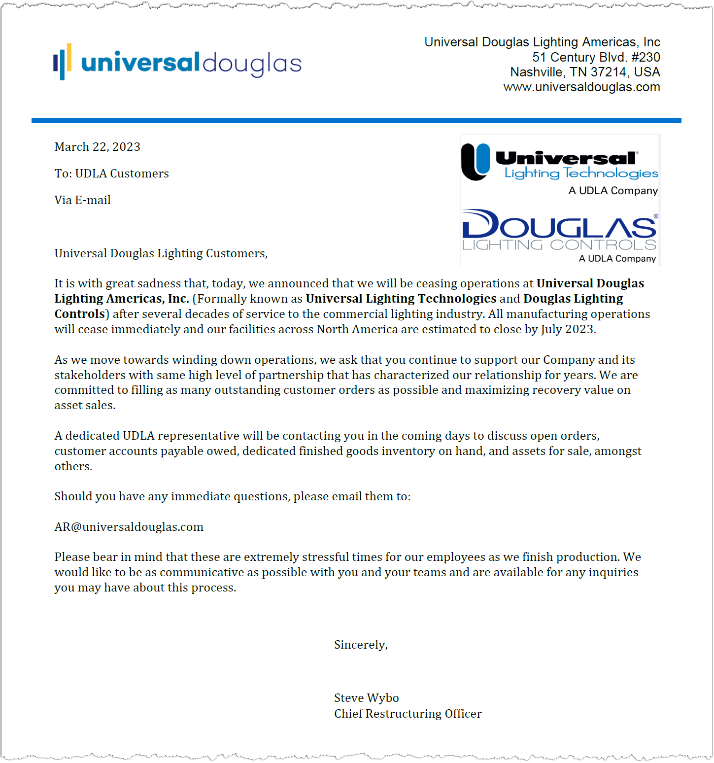 In today’s letter that went to distributor customers, the company described many goals “including maximizing recovery value on asset sales.” For a company that is shutting down, getting good ROI on remaining assets is important, but it seemed peculiar to put a self-serving goal like that into a letter to a distributor who may be left with a lighting mess to fix after Universal Douglas’ abrupt disappearing act.