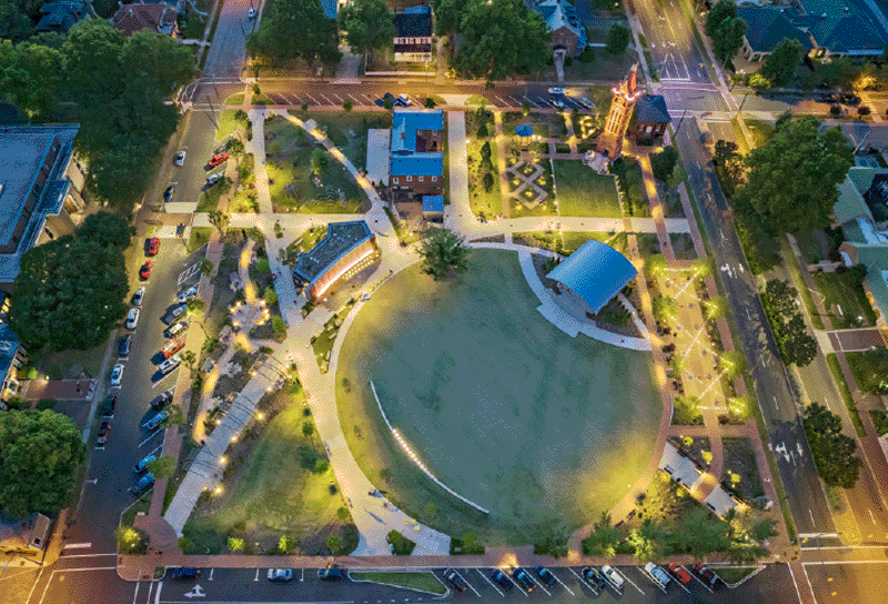 As Salisbury, NC’s most significant downtown green space, Bell Tower Green is the place where the community gathers to celebrate, connect and engage. Once a parking lot with remnants of outbuildings, these three acres are now comprised of outdoor rooms, southern gardens, playful spaces, interactive fountains and event areas.