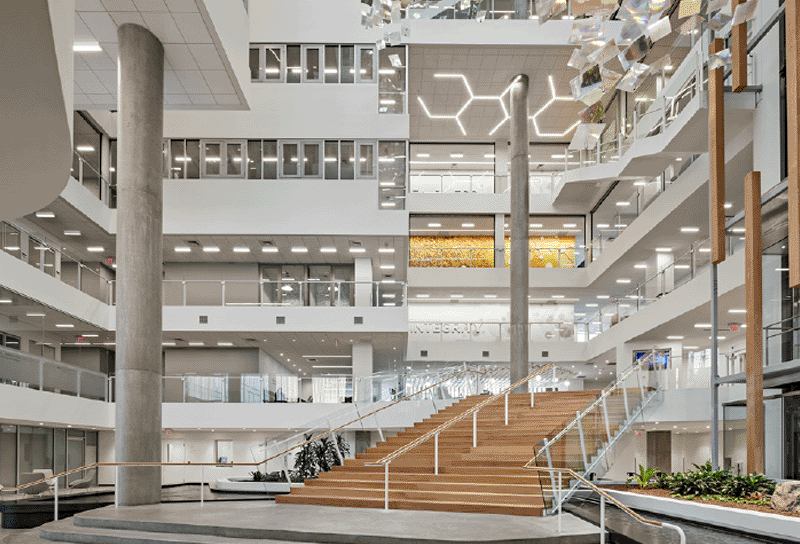 Bringing together over 500 of the nation’s top scientists, this new 263,000SF interdisciplinary research facility is home to future innovations in science, engineering, and fabrication. The client’s goal of fostering scientific discovery relies on creating spaces that accelerate connection and collaboration, while adapting to continuously changing research needs. The building’s unique form embodies the dynamic physics studied within, encouraging interaction through transparency, openness, and visual connectivity.