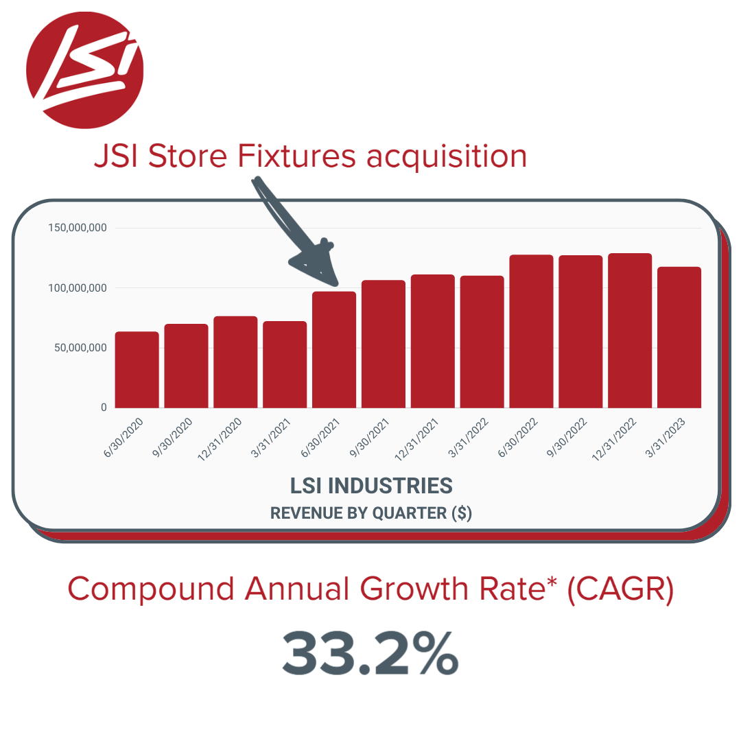 One acquisition was a huge boost to LSI Industries who acquired JSI Store Fixtures in May 2021. At the time JSI was generating approximately $70 million in annual revenues while LSI had produced $282 million in revenues during the twelve months before the acquisition.