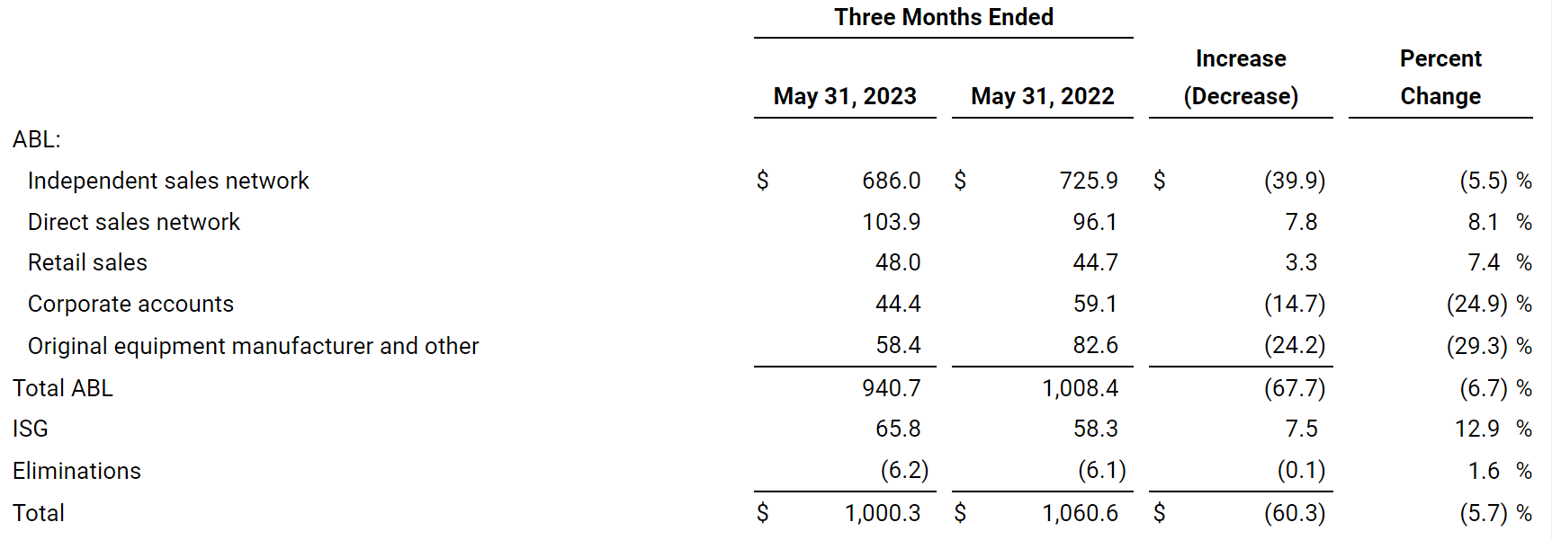The company's quarterly net sales decreased by 5.7%, or $60.3 million, compared to the prior year, which could be a concern if this trend continues. The number moved due to a sales decline in the Acuity Brands Lighting and Lighting Controls (ABL) segment, which comprises 94% of total company sales.