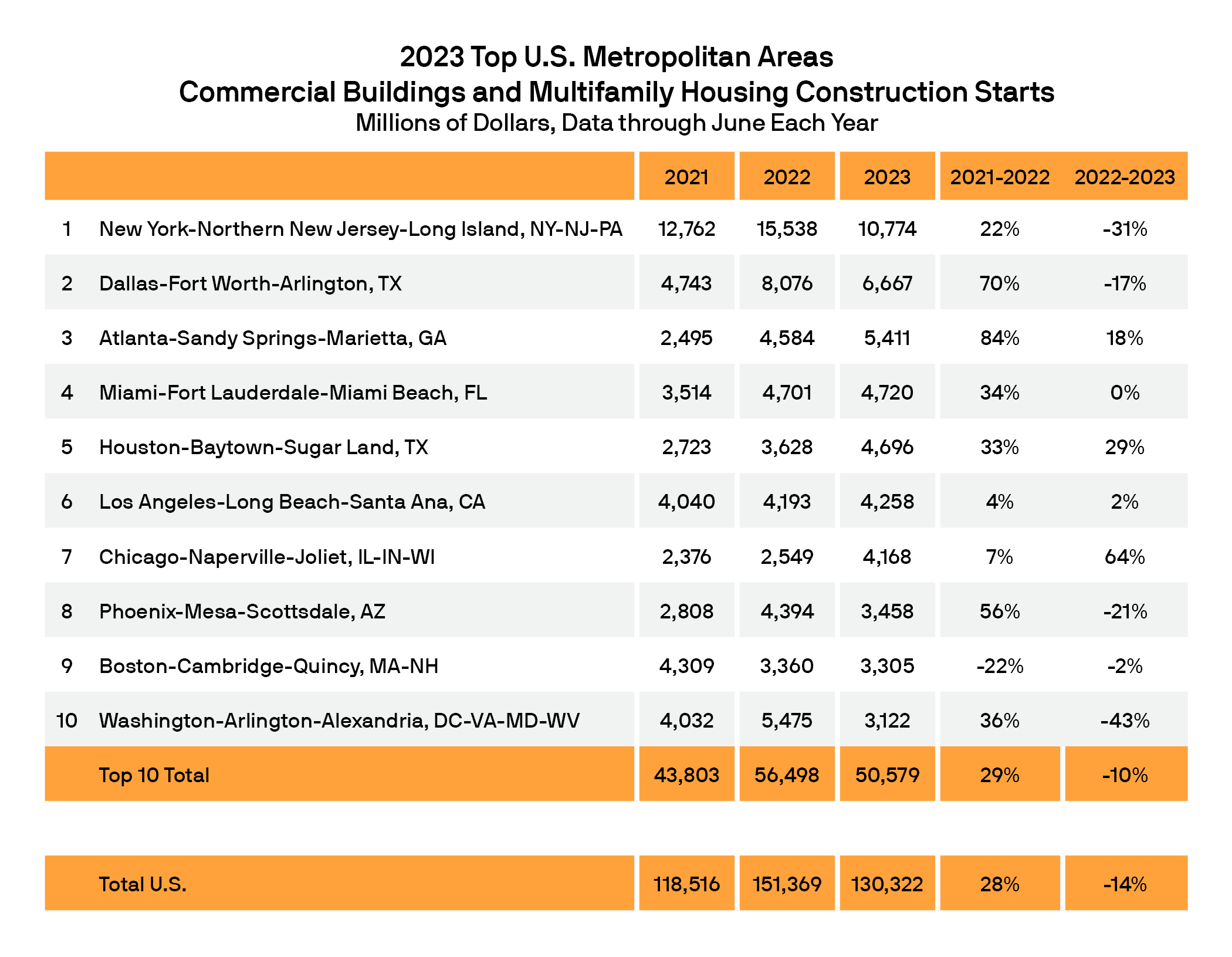 The top 10 metropolitan areas accounted for 39% of all commercial and multifamily starts in the United States in the first half of 2023, up from 37% in that of 2022.