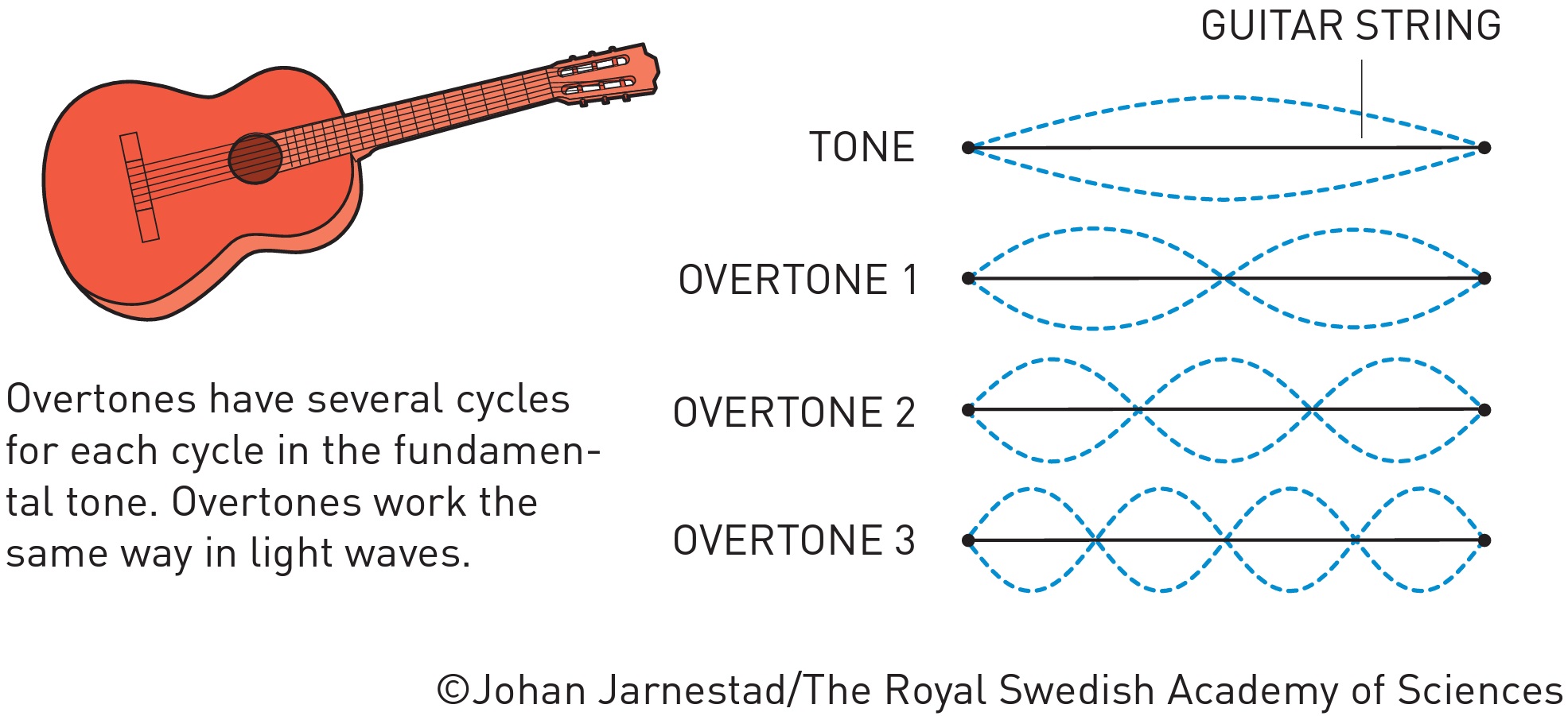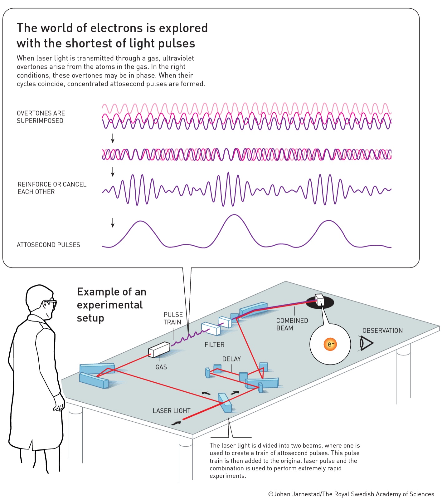 In 1987, Anne L’Huillier discovered that many different overtones of light arose when she transmitted infrared laser light through a noble gas. Each overtone is a light wave with a given number of cycles for each cycle in the laser light. They are caused by the laser light interacting with atoms in the gas; it gives some electrons extra energy that is then emitted as light. Anne L’Huillier has continued to explore this phenomenon, laying the ground for subsequent breakthroughs.