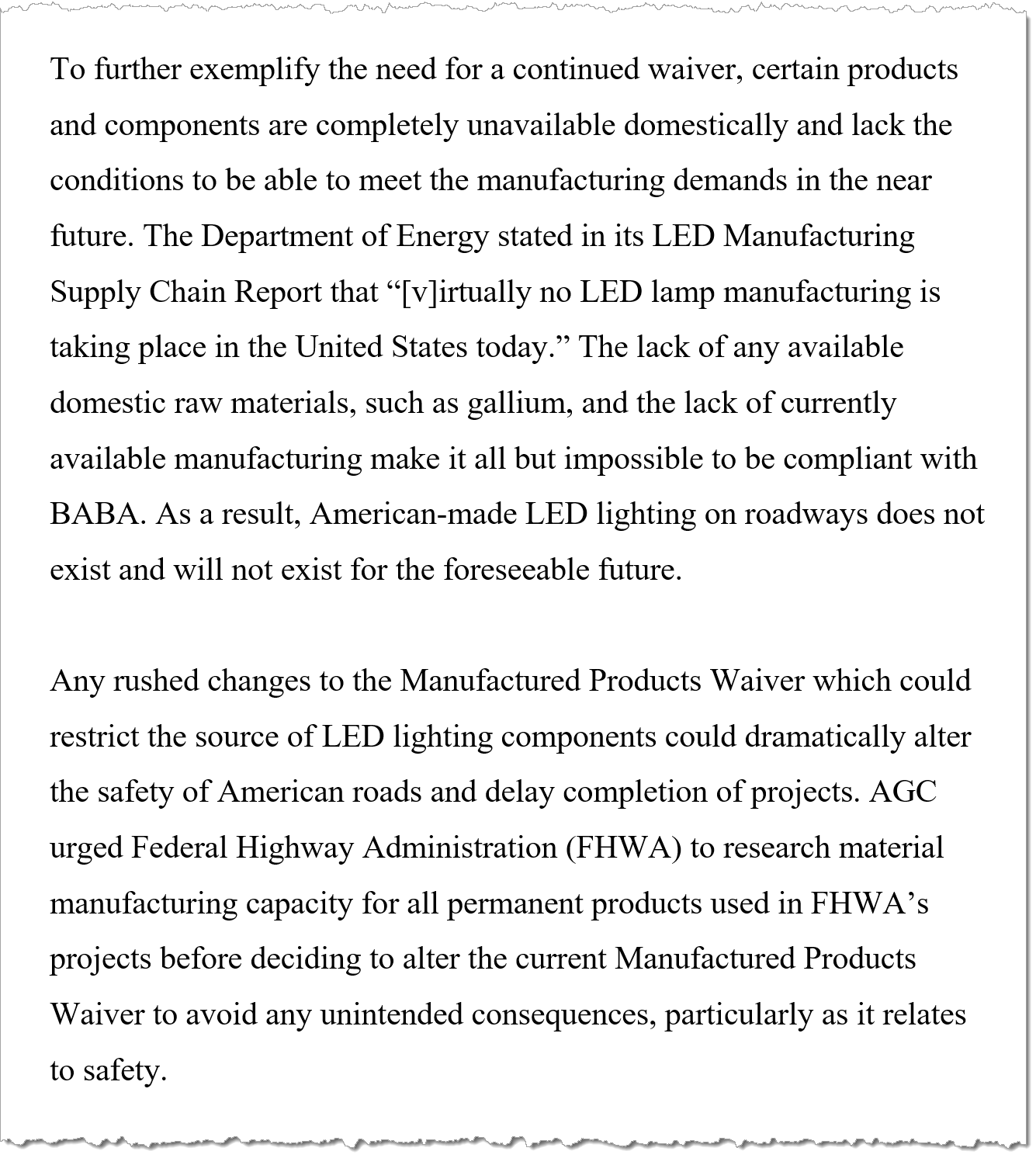 Edmondson's arguments may cause lighting industry stakeholders to note that BABA FAR 25.101(a)(2) mandates the cost of domestic components in BABA-compliant products to exceed 65% for items delivered from 2024 to 2028. For items delivered from 2029 onward, this requirement rises to 75%. Many U.S. manufacturers are producing LED Lighting products that reportedly meet the domestic component thresholds as defined by BABA.