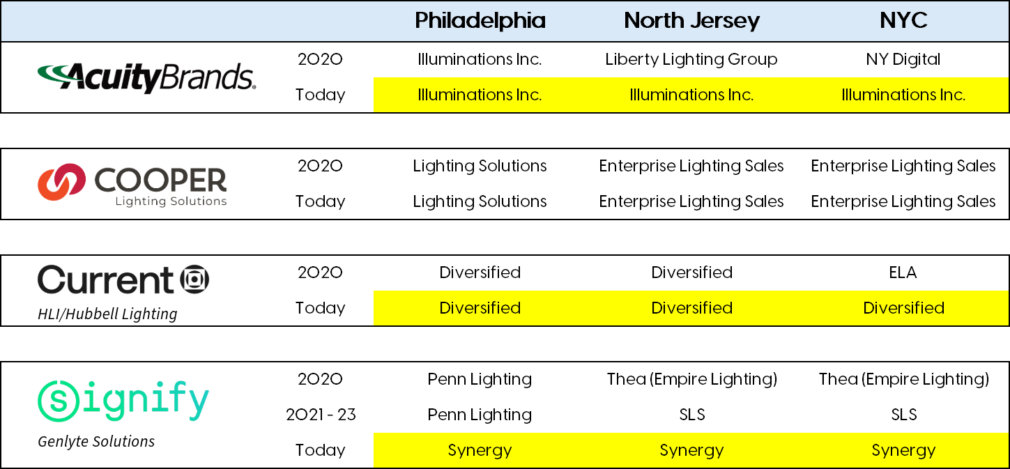 It's also noteworthy that three of the four major lighting brands have adopted a unified agency approach across these regions. Acuity Brands, Current, and now Signify's Genlyte Solutions are each represented by a single agency that covers the region from Harrisburg to Poughkeepsie. The exception to this trend is Cooper Lighting Solutions, which partners with Enterprise Lighting Sales in New York Metro and Northern New Jersey, while Lighting Solutions represents Cooper Lighting in Philadelphia.