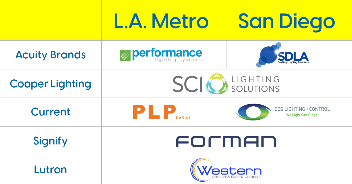 In contrast, some major agencies remain focused on more localized market approaches. For instance, Performance Lighting Systems and SDLA, which represent Acuity Brands, as well as PLP SoCal and OCS Lighting & Control, representing Current, maintain more specialized regional focuses.
