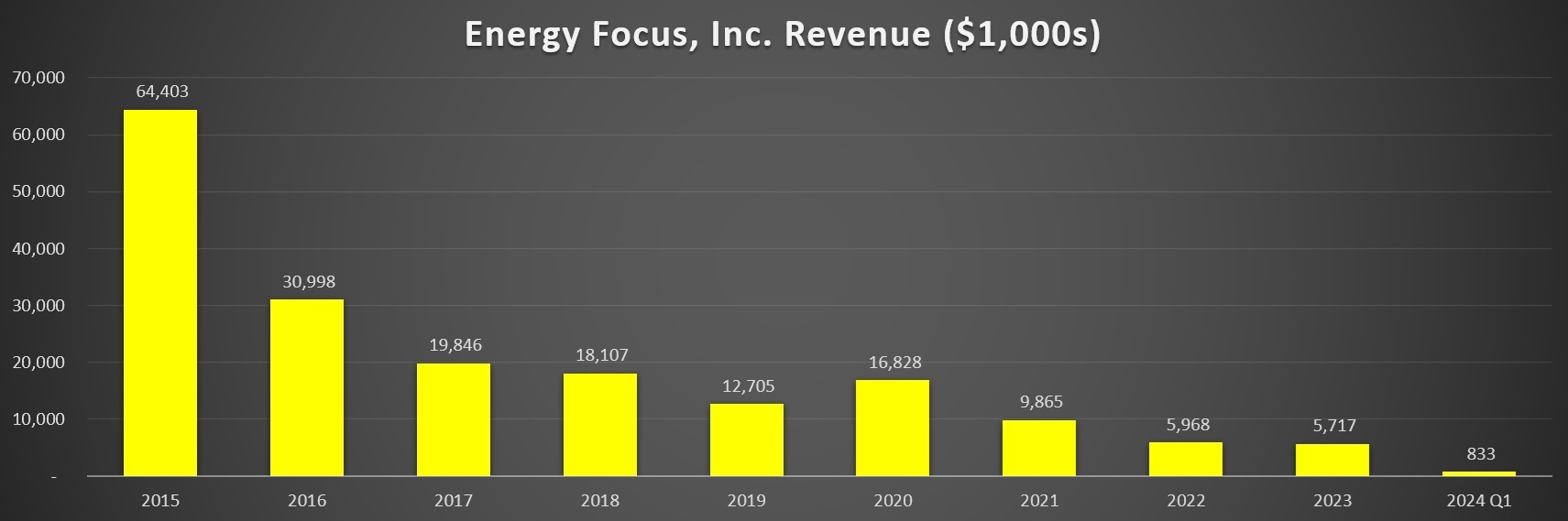 Energy Focus, Inc., an Ohio-based maker of energy-efficient lighting solutions, reported its financial results for the first quarter ended March 31, 2024. The company reported net sales of $833,000 in Q1 2024, marking a decrease of 10.4% compared to $930,000 in Q1 2023. The decline was primarily attributed to reduced sales in the military maritime sector and a slight decrease in commercial sales. This downturn is further compounded by a significant quarter-over-quarter drop of 65.2% from Q4 2023, driven by a $1.5 million decrease in military sales, despite stable commercial maritime sales.