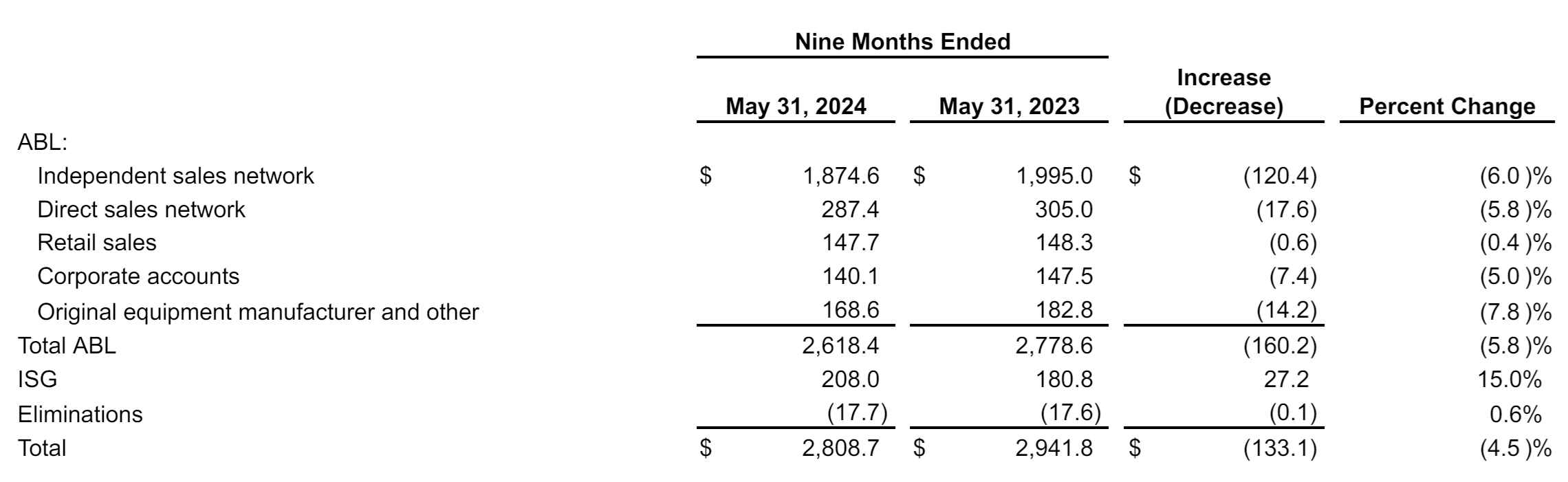 ABL Segment: Operating profit for ABL increased slightly to $151.5 million from $150.0 million, despite lower sales. The segment's operating profit margin improved by 100 basis points to 16.9%.