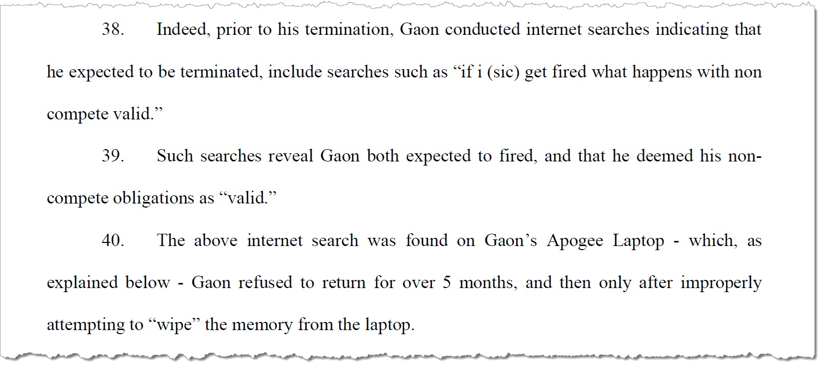 Gaon is accused of downloading, copying, and transferring Apogee's confidential information from his company-issued laptop before and after his termination. This act is seen as a direct violation of his employment agreements, which explicitly prohibited such actions. Furthermore, Gaon allegedly "wiped" the laptop's hard drive to erase evidence of his misdeeds, compounding the breach of his duty to safeguard Apogee's confidential data.