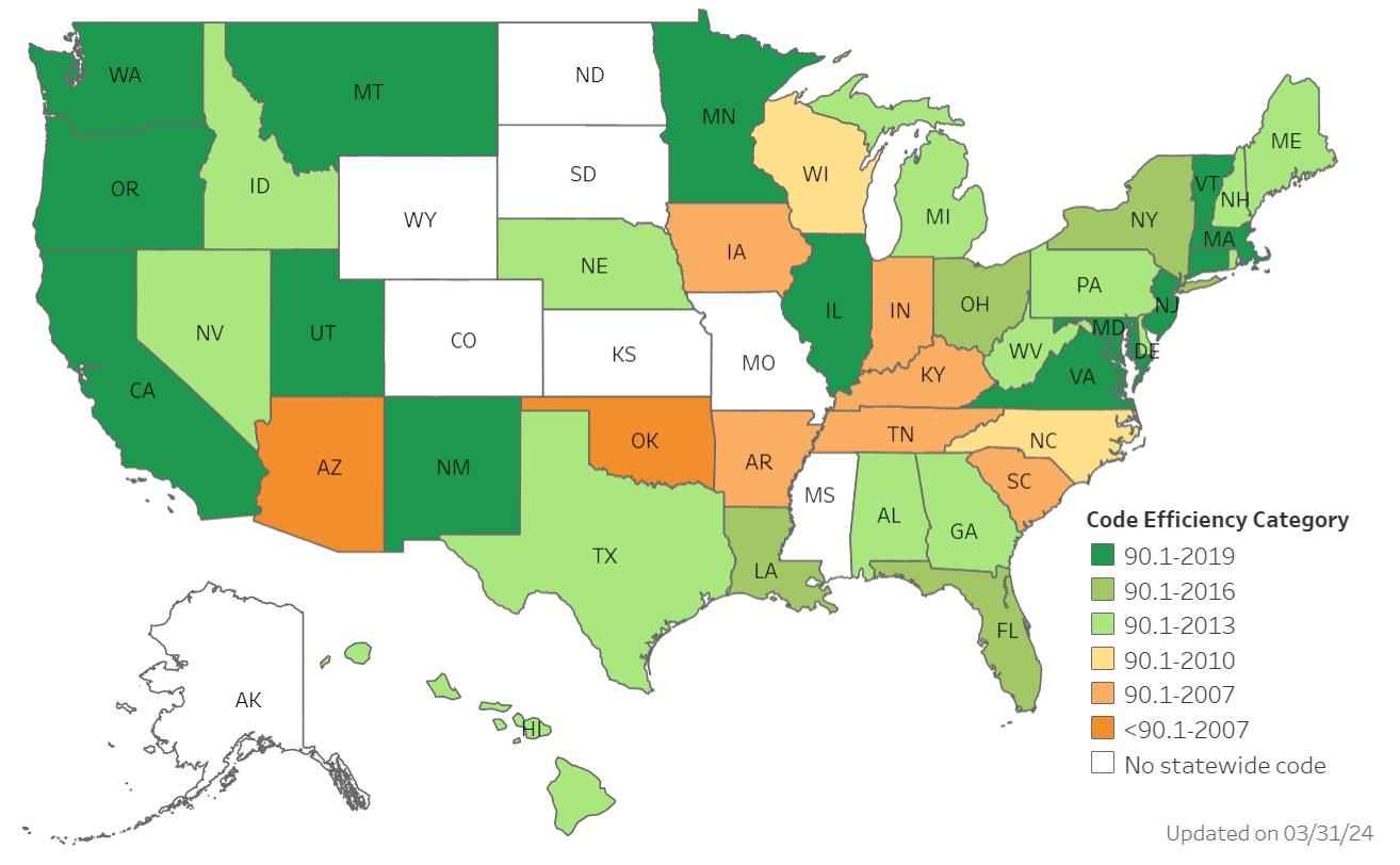 States may write their own codes, as California does with Title 24, Part 6, or adopt a model code or standard in whole or part. Other states do not have a statewide energy code, such as Colorado with its home rule constitution, though there may be significant adoptions at the county or municipal level.