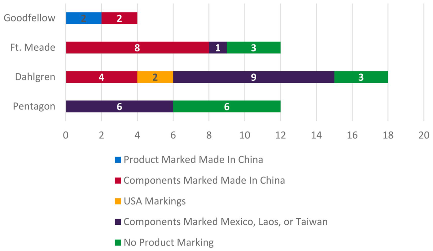 A project at The Pentagon revealed that six of twelve LED product models contained components marked “Mexico” or “Made in Taiwan.” The remaining six of twelve LED product models contained no country of origin markings. In addition, manufacturer documentation for the 12 LED product models from the contract file stated the products were BAA or TAA compliant.