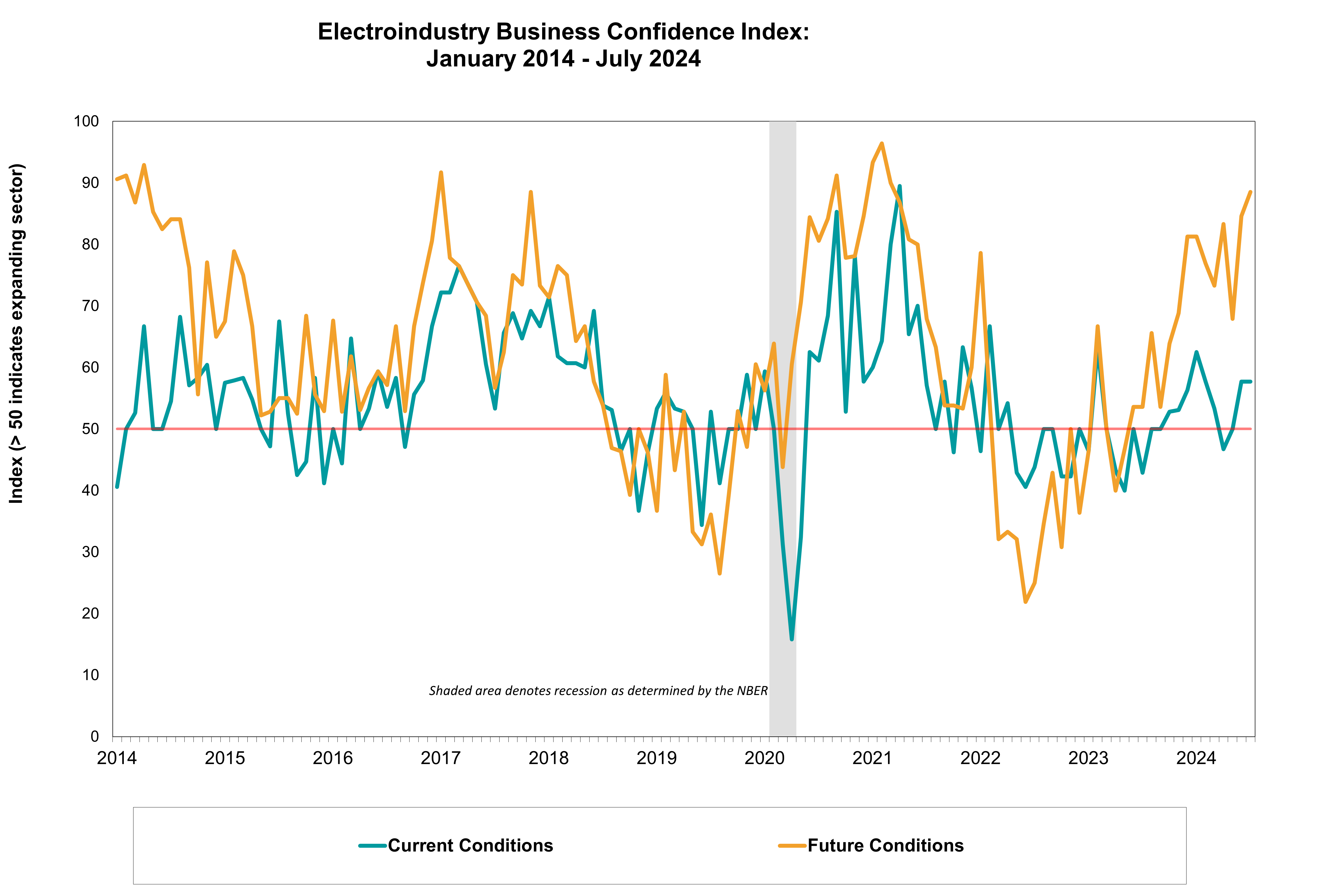 The future conditions component of the July 2024 survey rose to 88.5, marking 14 consecutive months of anticipated growth in the electroindustry sector and the highest score since Spring 2021. While current conditions remained steady, panelists expressed optimism for the next six months, citing expectations of reduced inventory levels and potential interest rate reductions. Over three-quarters of respondents anticipated better conditions, with none predicting a decline.