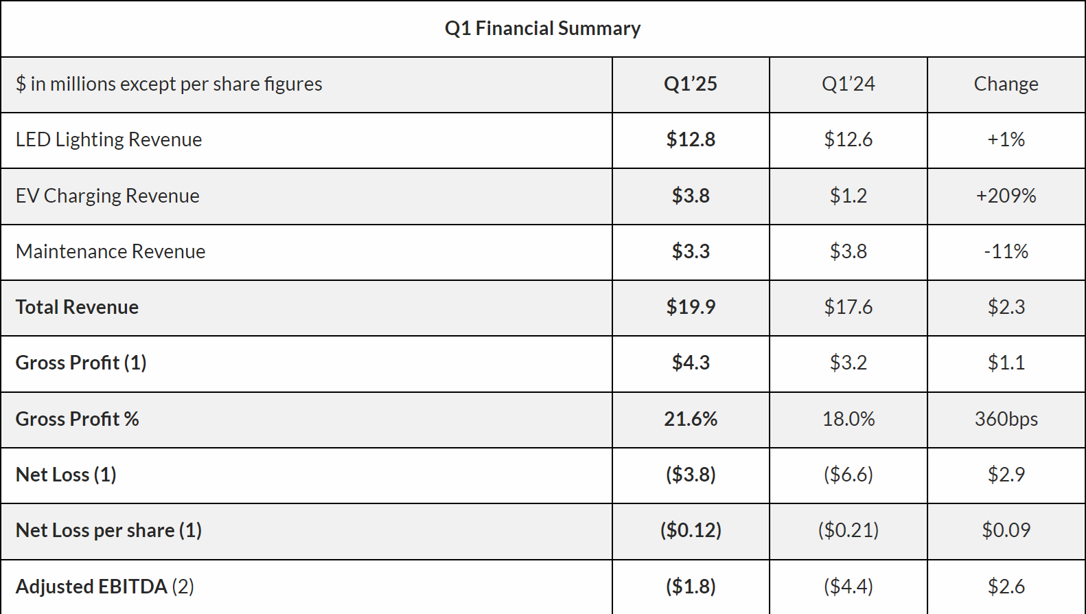 The energy-efficient lighting and EV charging station provider posted total Q1 revenue of $19.9 million, up from $17.6 million in the same period last year. The increase was largely attributed to a 209% jump in EV charging revenue to $3.8 million.