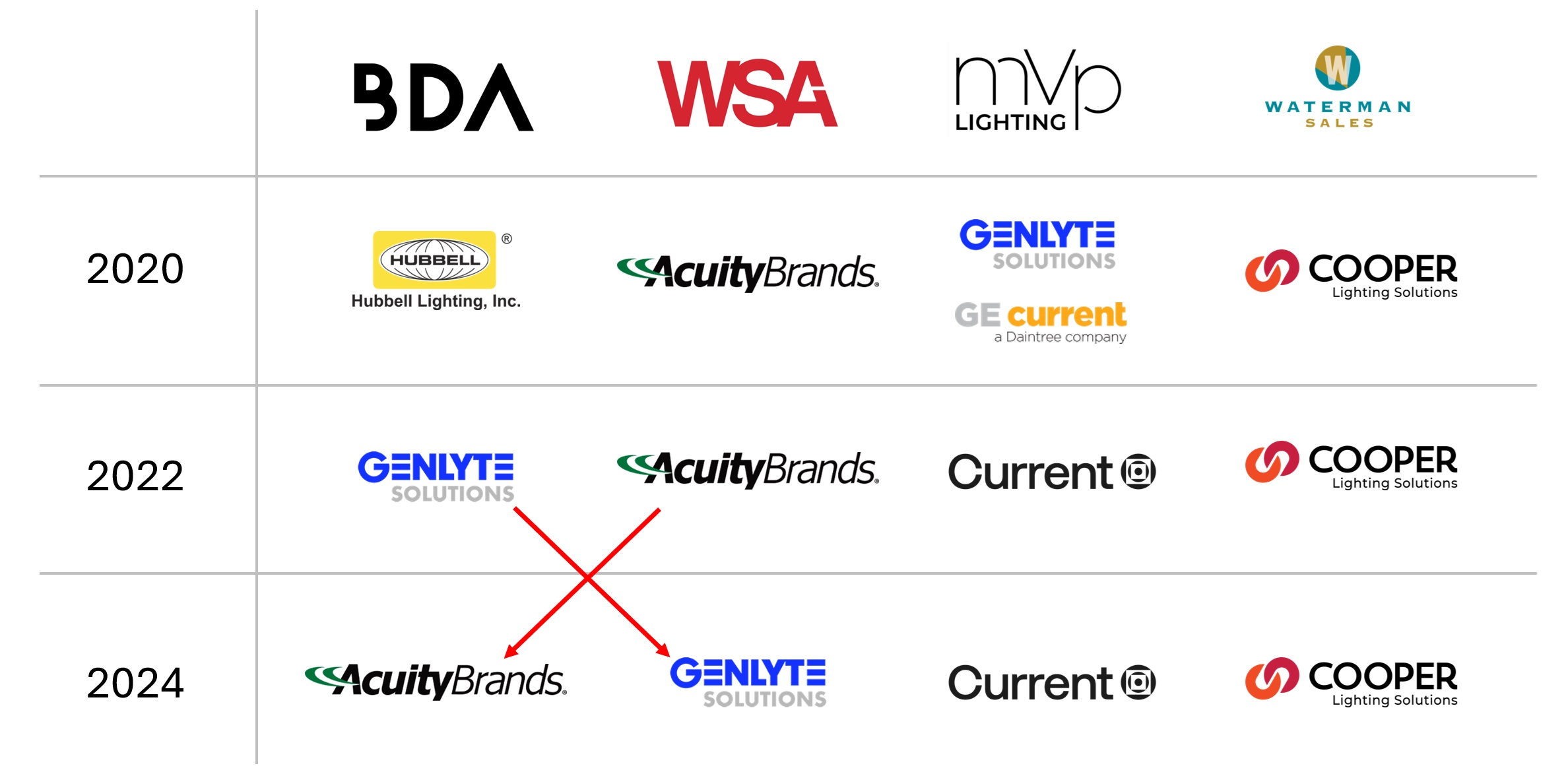 MVP Lighting: Currently represents Current, a relationship dating back to the GE Current era. In 2022, the year GE Current and Hubbell Lighting merged to become Current GLI and HLI, MVP went all in with Current after its partnership with Genlyte Solutions ended.