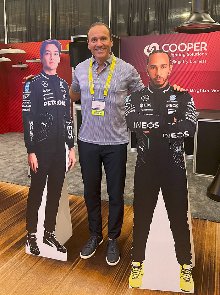 Above: Mercedes-AMG PETRONAS Formula 1 drivers George Russell (L) and Lewis Hamilton (R) pose with Al Uszynski of Inside Lighting at this week's Street & Area Lighting Conference in Atlanta.