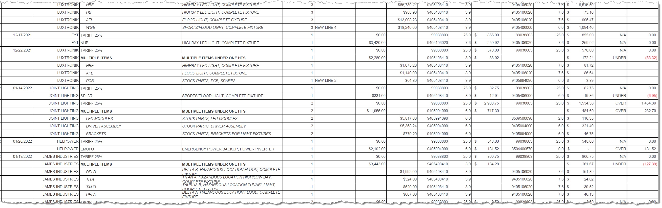 In May 2021, U.S. Customs and Border Protection began investigating SpecGrade’s imports and identified widespread misclassifications. Products such as LED floodlights, high bay lighting fixtures, and related parts were incorrectly classified under broad HTS codes that applied a lower duty rate of 3.9%, instead of more specific codes that carried higher rates. For example, U.S. Customs and Border Protection found that certain products should have been classified under codes with duty rates of up to 7.6%.