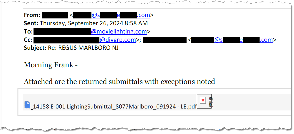 Above: A redacted email from electrical contractor, Sodon's Electric, to Moxie Lighting mistakenly included the salesman's old email address at Diversified and not his new Moxie email address