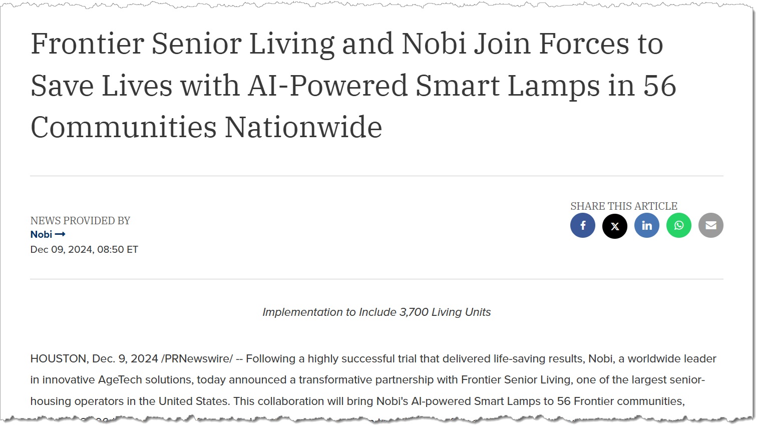 Frontier Senior Living, a senior living operator with 100 locations in states such as Arizona, Florida, and Georgia, is rolling out the Nobi Smart Lamps in 56 of its communities by mid-2025. This deployment will impact 3,700 residents, with the potential to significantly enhance safety and care standards. Frontier’s leadership expressed confidence in the technology, citing its privacy safeguards and potential to differentiate their communities in a competitive market.