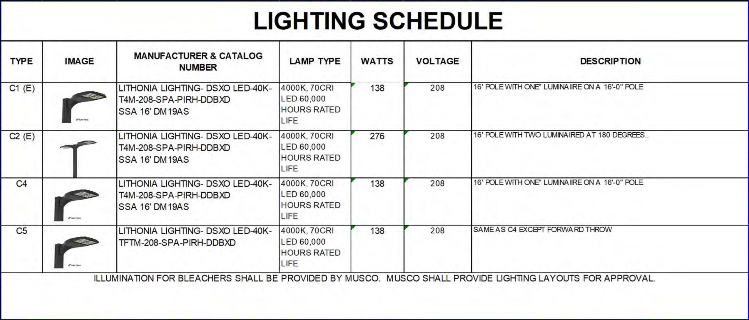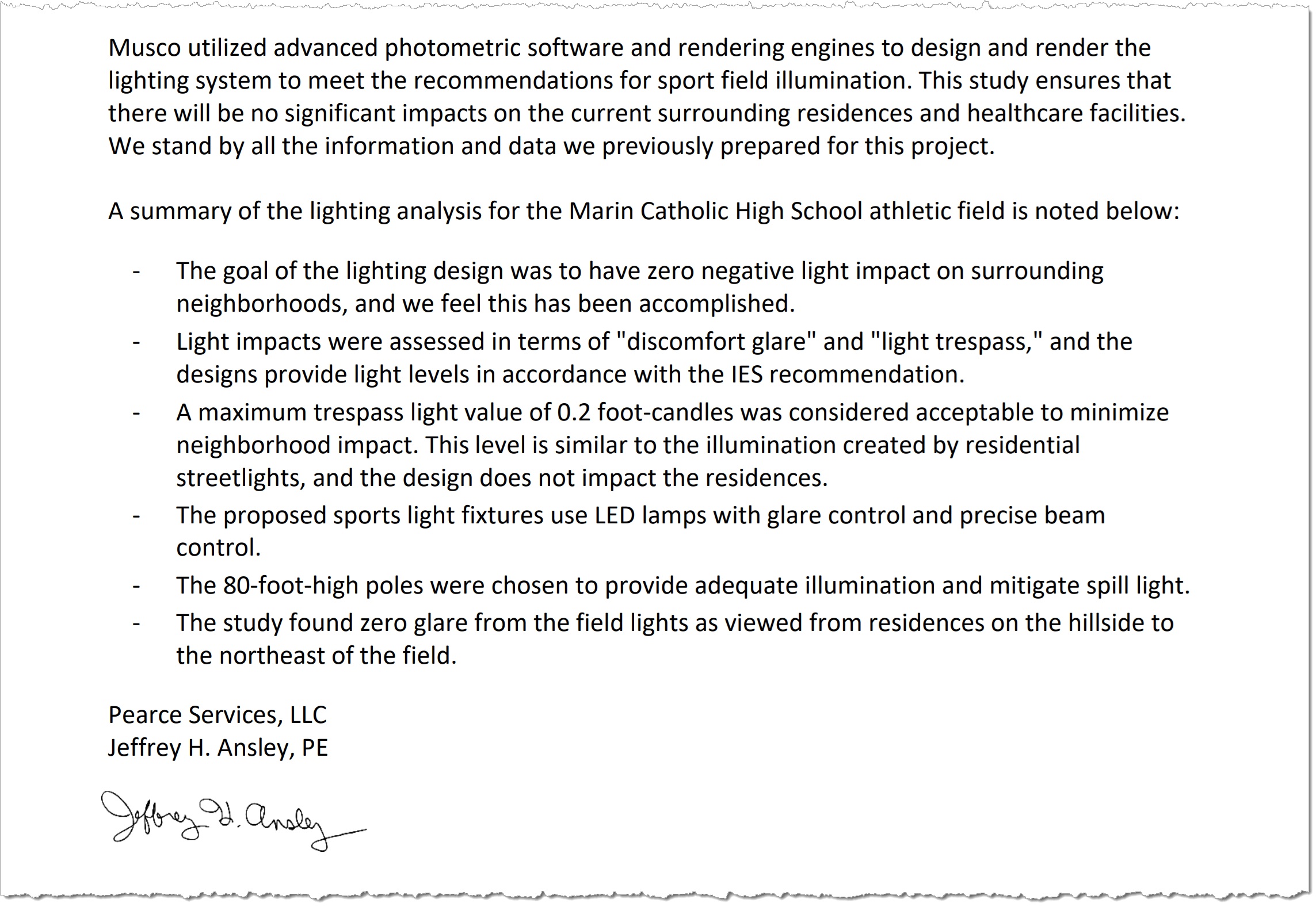 On paper, Marin Catholic’s lighting plan is relatively straightforward. The specified system, manufactured by Musco Lighting, consists of four 80-foot poles, each outfitted with seven 1,500-watt LED fixtures. Additional wayfinding lights (Lithonia Lighting specified) — atop 13 aluminum poles, each 16 feet tall — will illuminate paths and bleachers. According to county records, the design is meant to keep light spill to a minimum, using shielding technology to direct illumination only onto the field.
