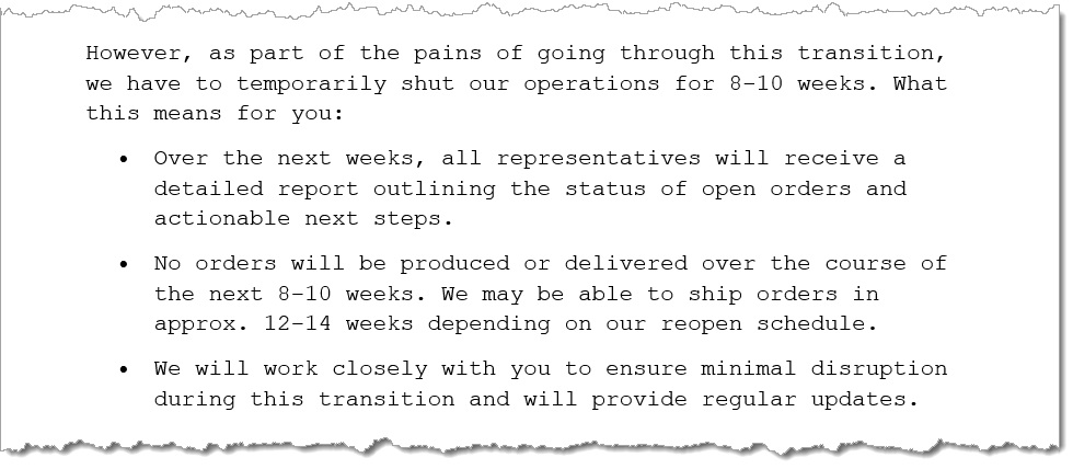 Here’s what’s clear: Utopia is halting all production and deliveries, meaning no orders will go out for at least two months, possibly longer. They say agents and reps will receive updates on open orders, but there’s no firm commitment on what happens if those orders remain stalled.