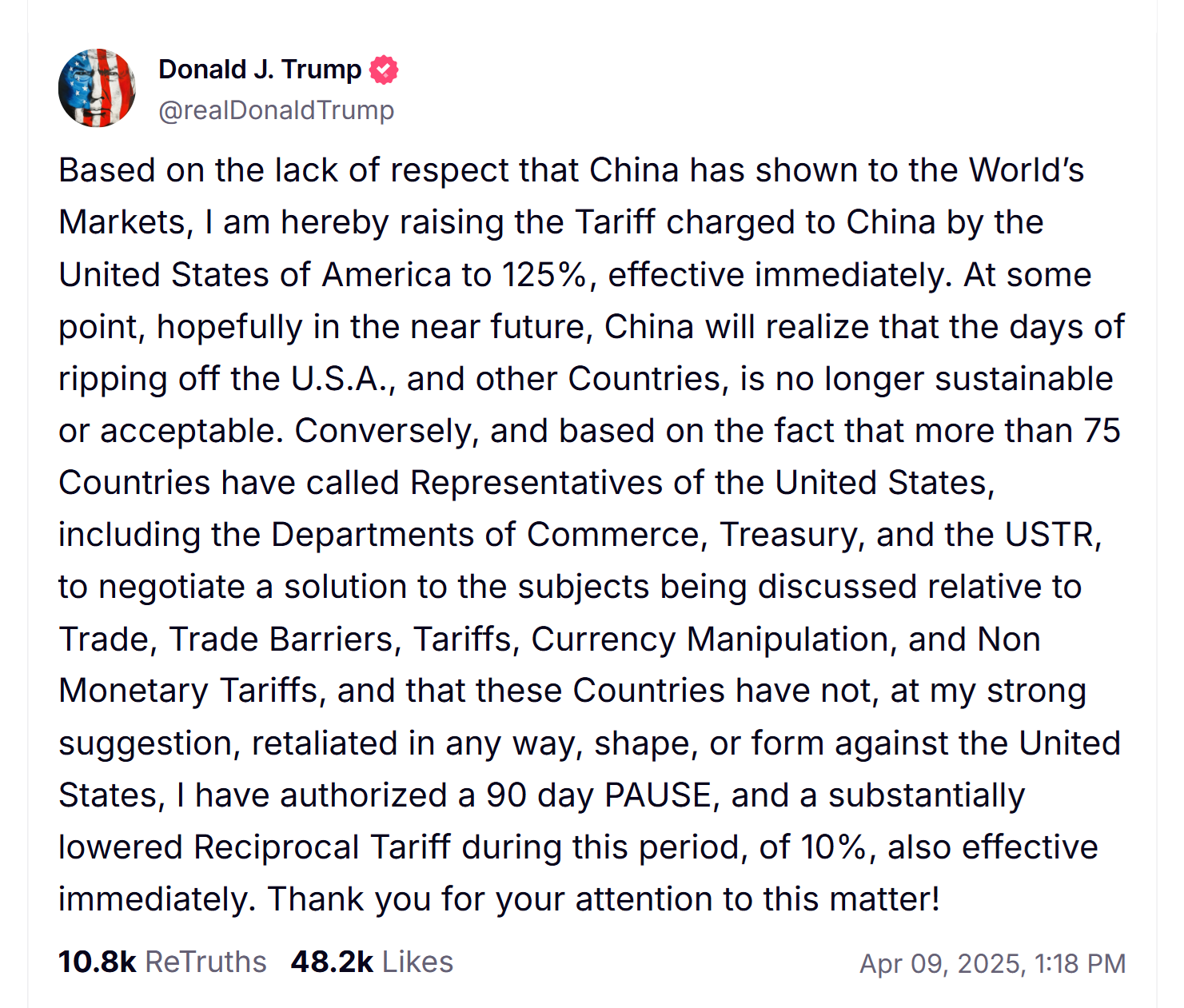 In a single Truth Social post, President Trump announced another escalation and an unexpected retreat: tariffs on Chinese goods would rise immediately to 125%, while new reciprocal tariffs on most of the rest of the world would be paused and replaced with a flat 10% rate for the next 90 days.