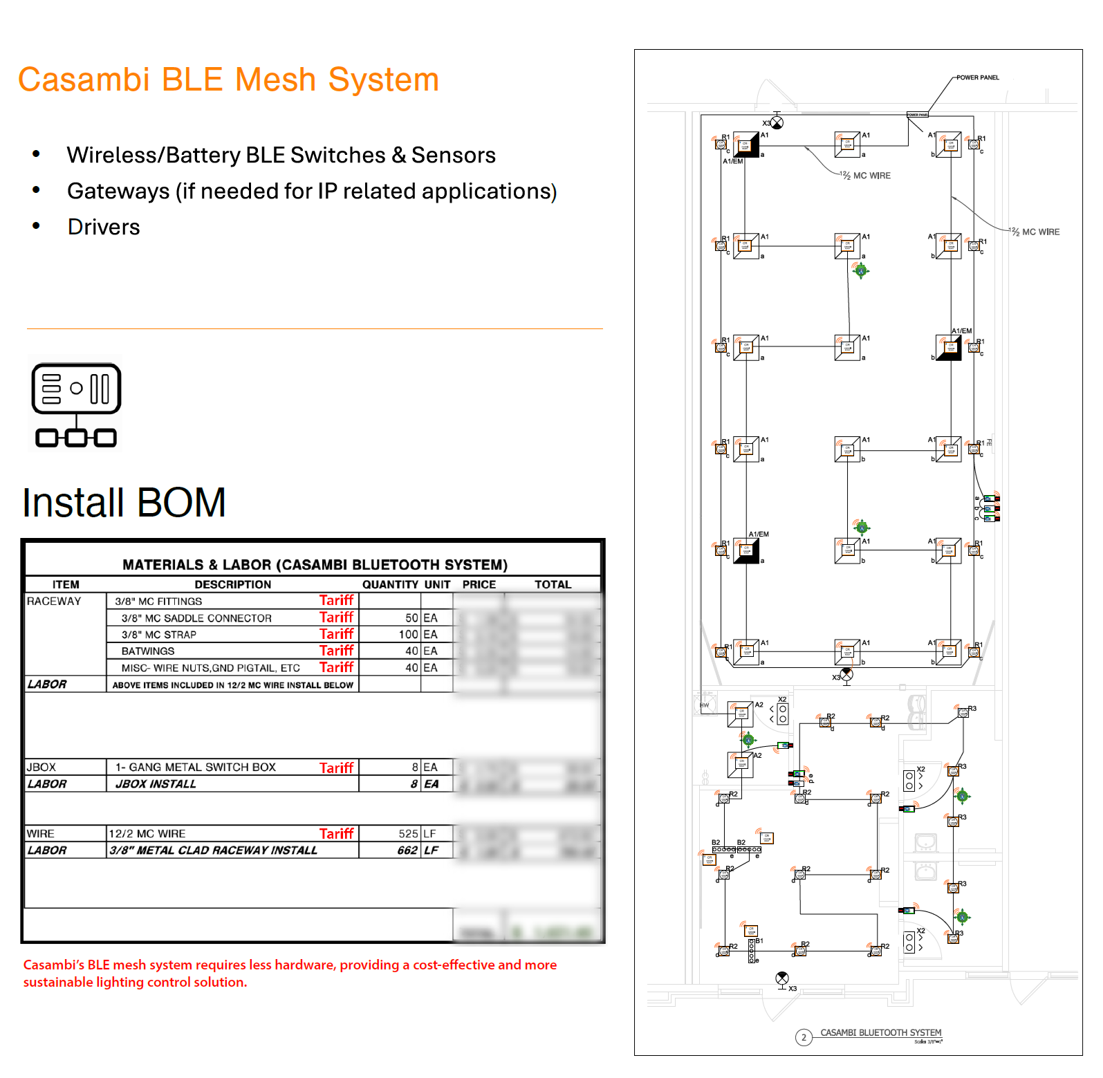Legacy lighting systems lean on centralized hubs and gateways—hardware-heavy setups that are often imported and now hit with tariffs. Casambi flips that model on its head with a wireless Bluetooth mesh network that distributes control across the system itself. No single point of failure. No bulky boxes. Nothing hidden behind walls to support hardware. Just smart, scalable control baked into the network—less hardware to buy, ship, and ultimately get tariffed in customs.