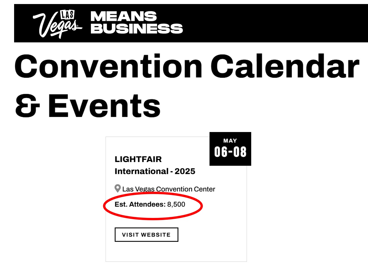 Above: Las Vegas Convention Center website cites 8,500 estimated attendees for LightFair 2025 (May 2).