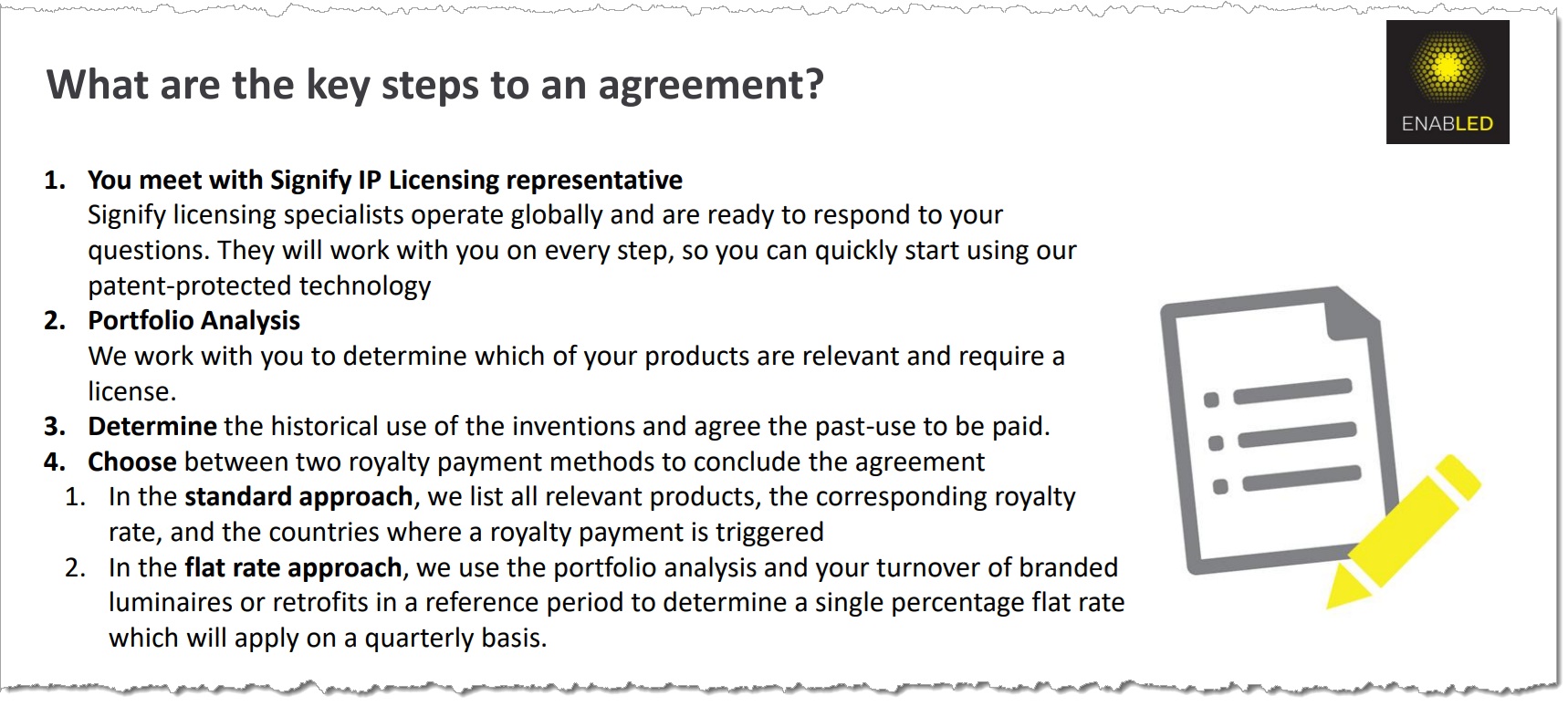 Signify updated the slide deck of its EnabLED Licensing Program, a key program that supports its grip on the LED market's intellectual property terrain. The refreshed terms reveal a tiered royalty systemthat leaves little ambiguity about what’s owed and when — though some manufacturers reportedly negotiate customized licensing arrangements that are more favorable than these published terms.