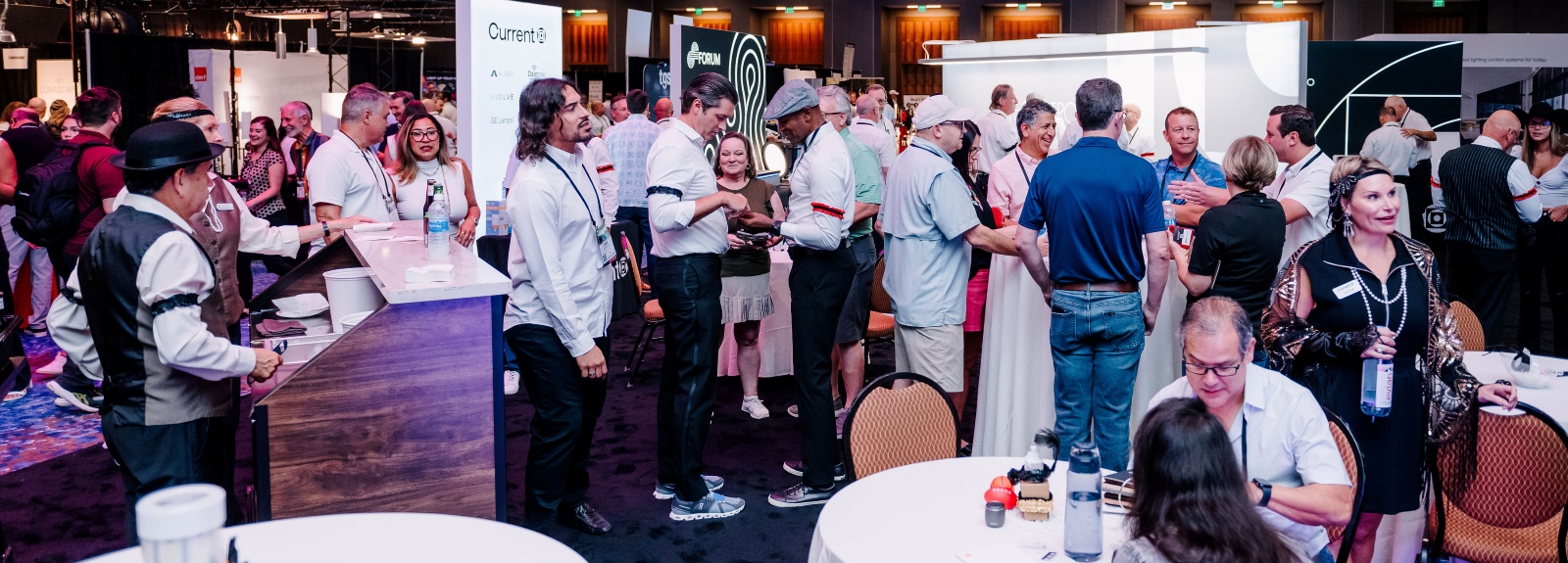 Current staged a 2,500-square-foot throwback to the Roaring Twenties, complete with costumed staff. H.E. Williams created an immersive "factory floor" environment, while LSI Industries gamified its booth with football-themed product displays.