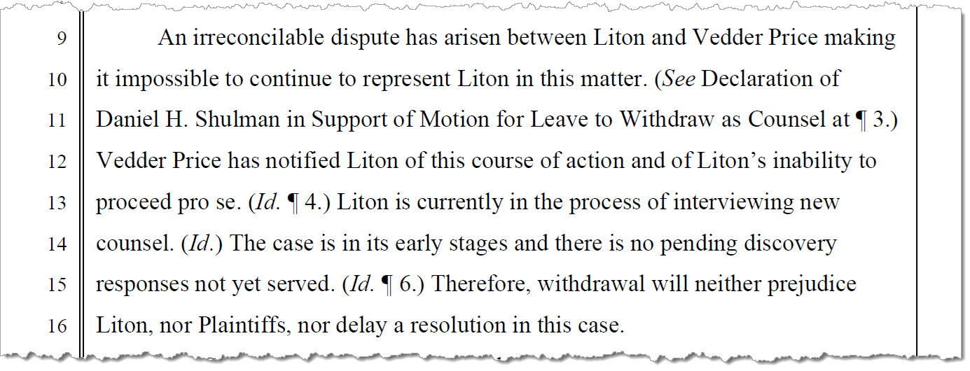 Three days before the case settled, Liton’s legal team at Vedder Price filed a motion to withdraw, citing an “irreconcilable dispute” that made continued representation “impossible.” Court documents revealed that Liton had already begun searching for new counsel. The motion also noted that the company had recently entered direct settlement talks with Signify, without its lawyers present — a rare move in federal IP litigation.