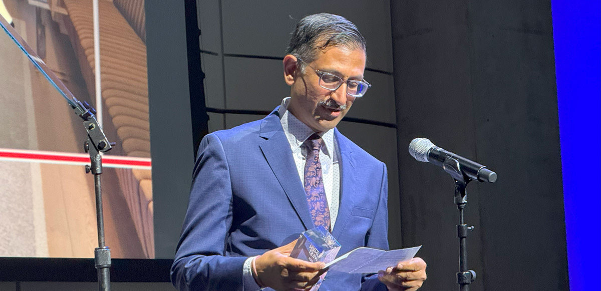 Above: Archit Jain of Oculus Light Studio accepts one of three awards presented to the firm at Lumen West 2025