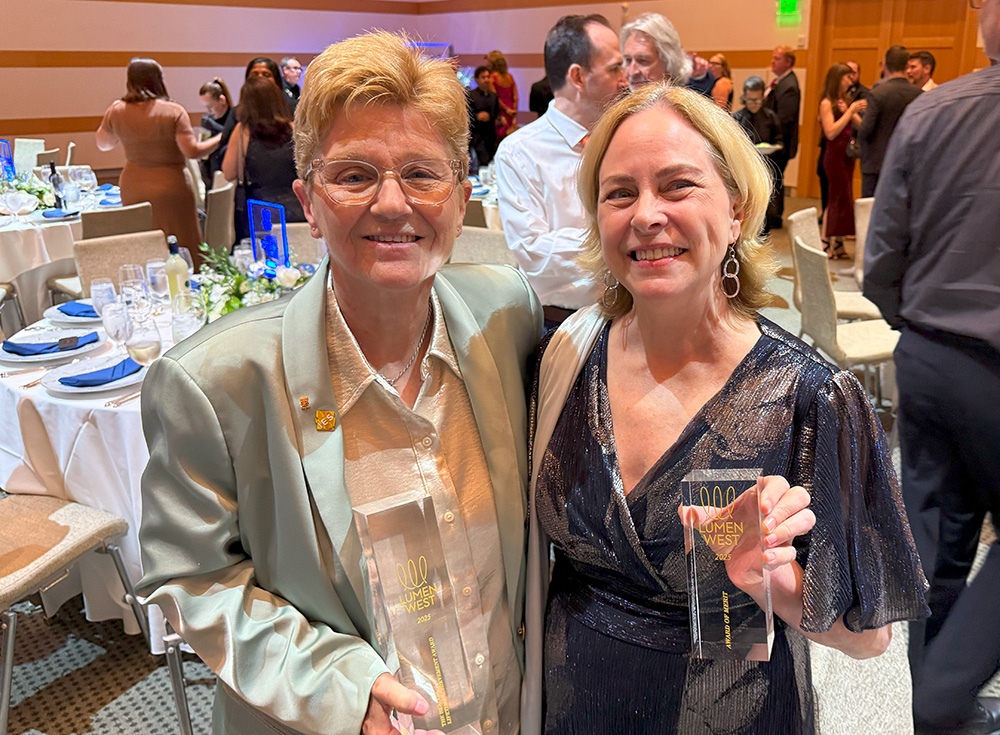 This year’s Beacon Award, the highest individual honor from IESLA and a recognition of lifetime achievement, was presented to Dawn Hollingsworth, a longtime lighting designer and former president of the IES Los Angeles Section. She also received an Award of Merit for her recent work on the Glendale Central Library Youth Services Renovation.