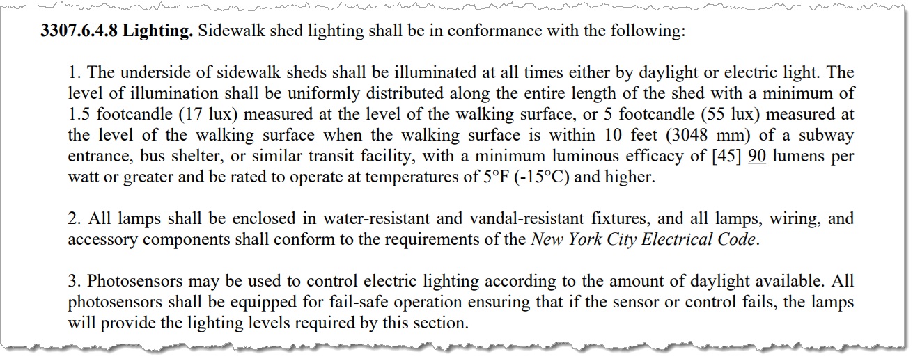 For scaffold-focused lighting people, the updates are especially notable. The legislation doubles the required illumination under sidewalk sheds, mandates LED lighting, and reinforces code standards that call for uniform levels of 1.5 footcandles (17 lux) along walkways, or 5 footcandles (55 lux) near subway entrances. Fixtures must also prevent light trespass when close to residential windows, ensuring brighter and more considerate city streets.