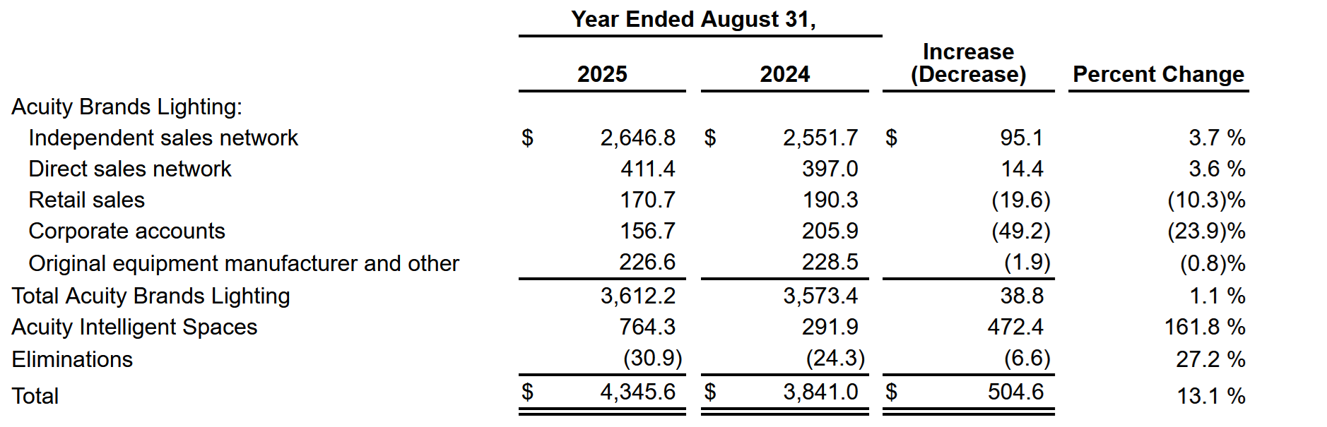 The company noted strength in its independent agent network, where project activity remains steady, even as other sectors within the Lighting business saw less traction. Though Acuity didn’t provide a full expense breakdown, they acknowledged the need to adjust expenses midyear when some sales “didn’t materialize the way that we had predicted.” Notably, Corporate Accounts were down 24%, a figure Ashe explained as reflecting the variable capital spending of a concentrated group of large customers.