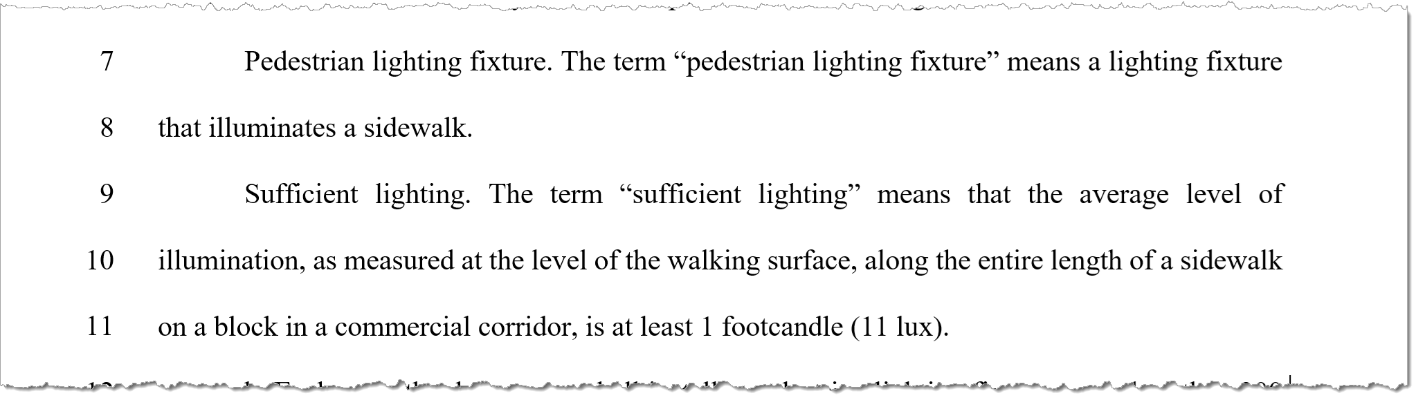 City Council requires 1.0 footcandle sidewalk brightness across 300 blocks per year